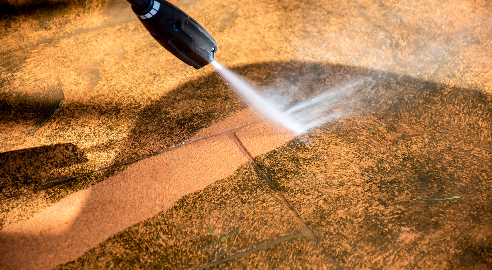 Spread some biodegradable detergent on the surface to help cut through the dirt and make sure you’re not damaging the surfaces as you go. Don’t use the garden hose (except for rinsing away the dirt). The pressure probably won’t be strong enough to do the job properly and it uses much more water.