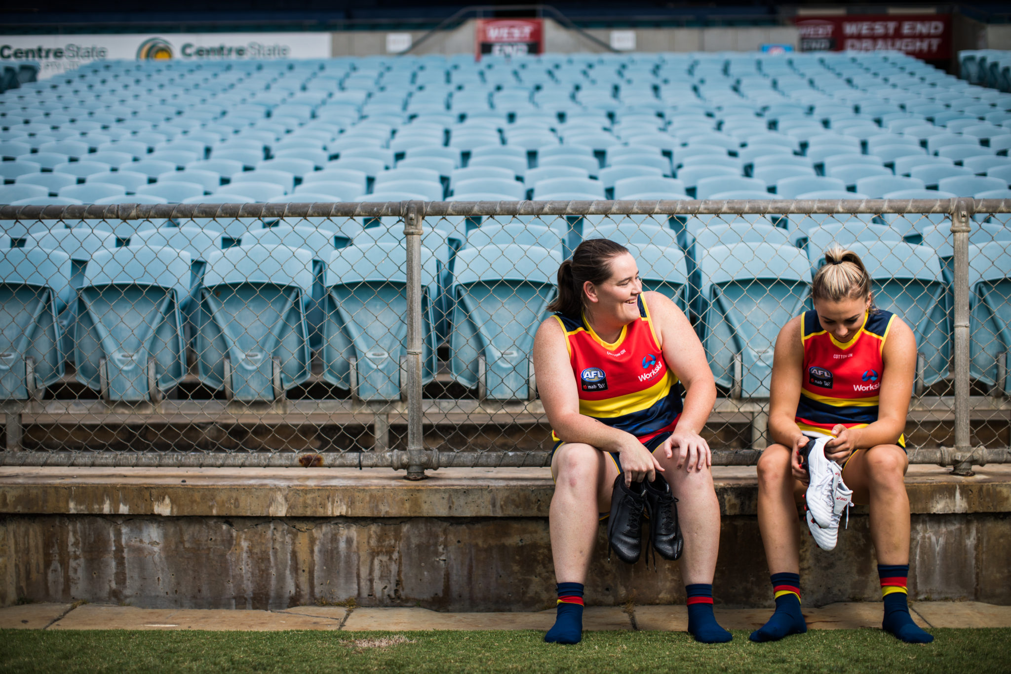 It’s a calendar filled with old photos of her teammates – some daggier than others. “I rushed it a bit, but the joke’ll still be worth it. There’s some real pearlers in there,” she laughs. It’s refreshing to see how candid the women are, and to hear how the sense of fun and friendship –which was so apparent on-field during the inaugural AFLW season – carries over into their off-field lives. “We all have our quirks and we’re all different, but as soon as we walked through those doors, we were family, and that’s something Bec [Goddard, Crows coach] encouraged from the start,” says Perkins.