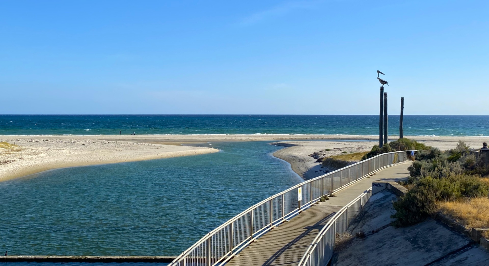 After a caffeine and muffin recharge, continue beside the Esplanade to the Torrens River outlet, where two alarmingly lifelike, Tim Burton-esque pelicans stand guard atop riverside poles.
